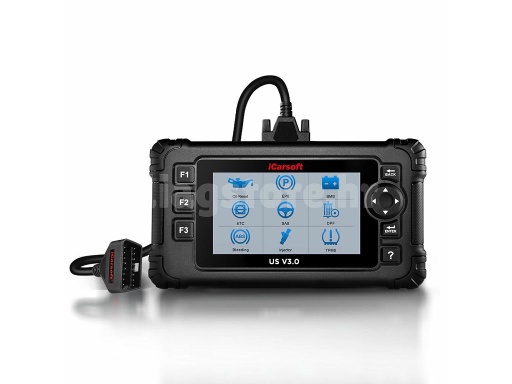 iCarsoft US V3.0 je dijagnostički alat koji omogućuje povezivanje sa svim upravljačkim jedinicama vozila Chrysler, Ford, General Motors, Holden i Jeep. Uređaj je opremljen 4" zaslonom u boji i spreman je za upotrebu. Ažuriranja softvera uređaja su potpuno besplatna i obavljaju se putem računala (USB kabel uključen). Uređaj ima širok raspon podržanih jezika. Podržani su automobili od 1996. do 2020. Instrument omogućuje detaljnu dijagnozu svih jedinica, a također nudi veliki broj servisnih funkcija kao što su resetiranje servisnih intervala, regeneracija DPF-a, dijagnostika i otpuštanje električne ručne kočnice, kodiranje injektora, registracija akumulatora i još mnogo toga. Uređaj je spojen na automobil putem OBD-II kabela.