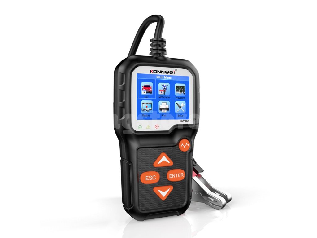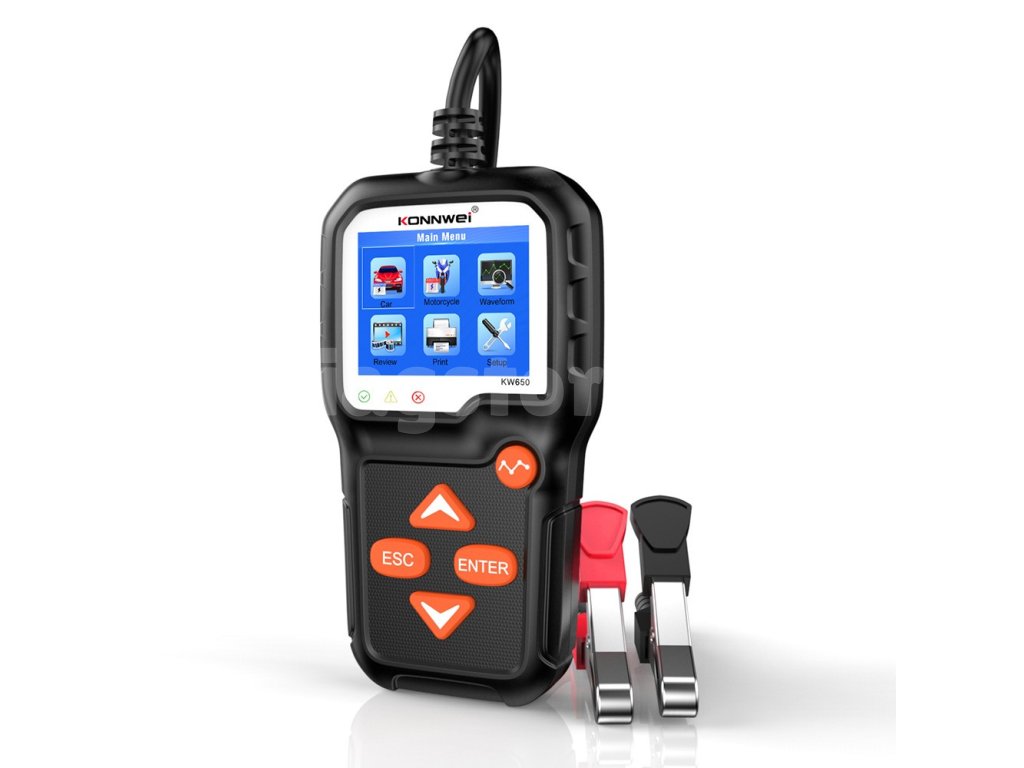 Konnwei KW650 je tester automobilskih akumulatora s jasnim zaslonom u boji i praktičnim rukovanjem koje pruža rano upozorenje o potrebi zamjene akumulatora. Brzi odziv zahvaljujući STM32 čipsetu. Točni rezultati i širok raspon primjena za većinu automobilskih ili brodskih akumulatora. Podržani su svi tipovi automobilskih akumulatora, uključujući gel, AGM i tekuće akumulatore. Zaštita od nepravilnog ožičenja - obrnuto ožičenje neće oštetiti instrument, akumulator automobila ili vozilo. Ispitivanje prema odgovarajućim standardima, uključujući DIN. Novi instrument omogućuje brži prikaz grafikona u usporedbi s KW600 - pomoću posebnog gumba, a također podržava testiranje 6V akumulatora. Osim toga, ispod zaslona nalaze se i tri LED indikatora.